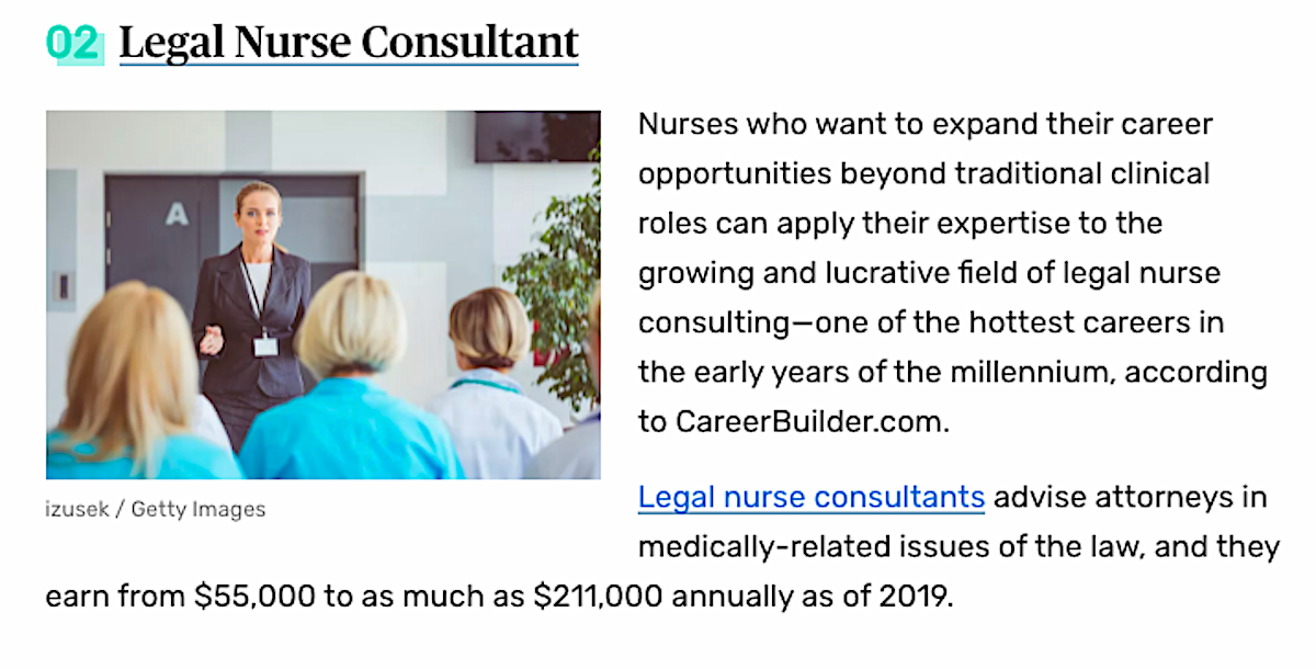 Legal Consultant: A legal consultant is similar to a management analyst, in that they propose ways to improve an organization’s efficiency. Legal consultants also provide expert and professional legal advice to businesses or individuals. Depending on the consulting focus, a legal consultant can advise on a number of important matters such as corporate law, real estate law, employment law and medical law. A legal consultant can work on their own or belong to a consulting services firm. I