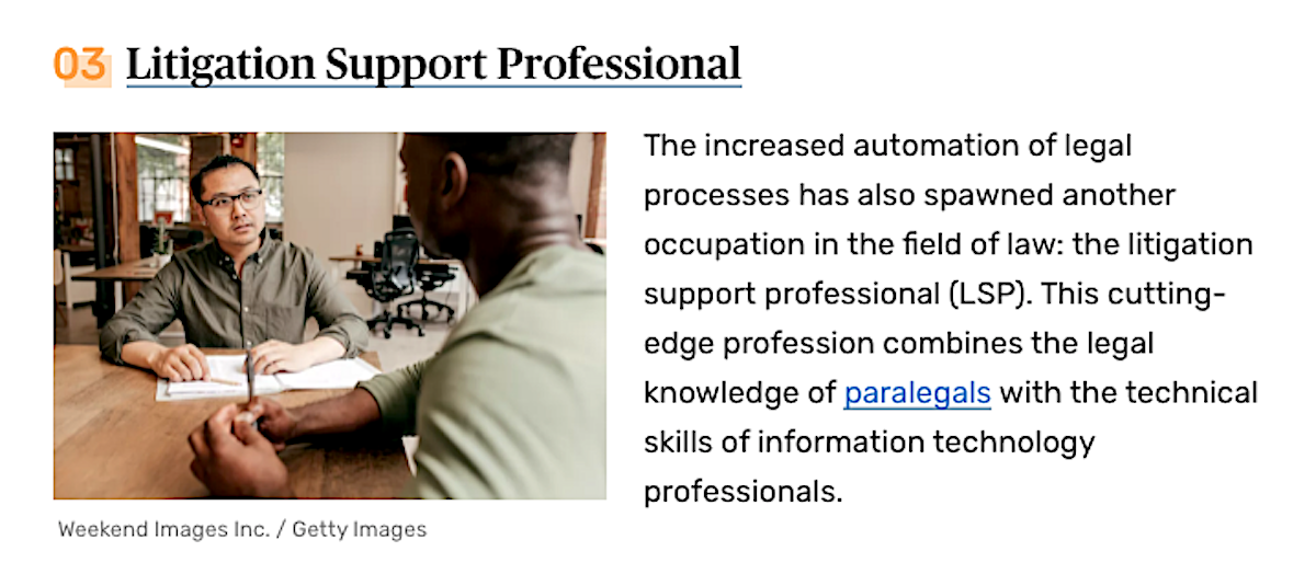 The legal market is thriving. Added regulations, economic growth, advances in technology, and increasing caseloads have all fueled the demand for a growing range of talented law professionals in a number of roles, from e-discovery specialists to compliance specialists, as shown here: